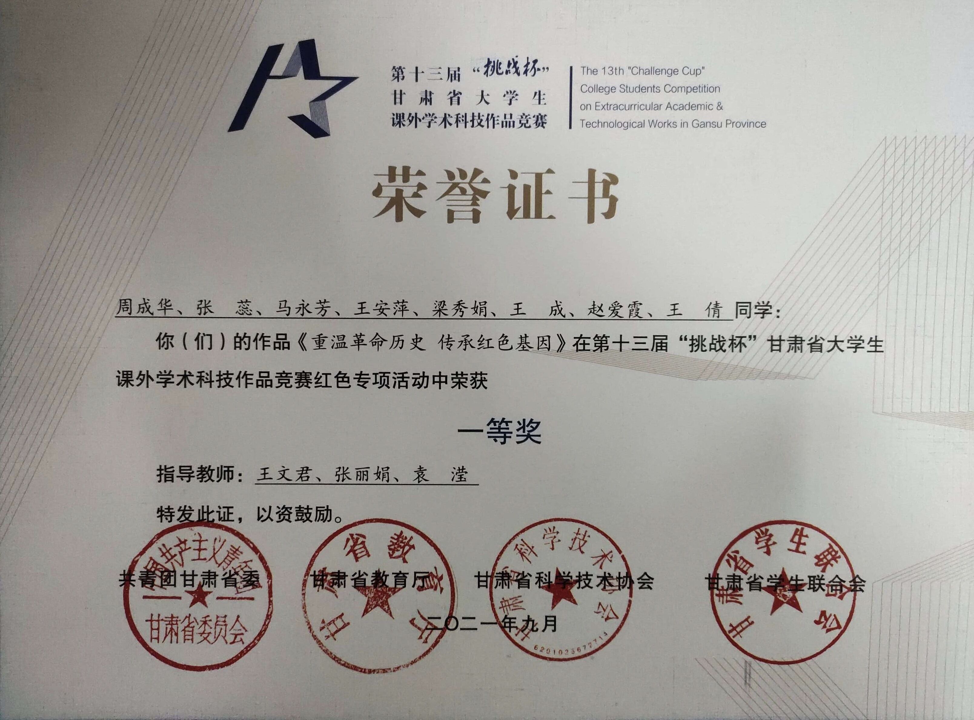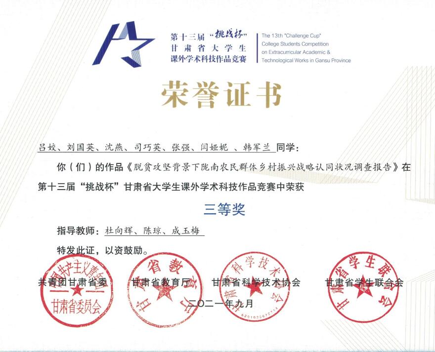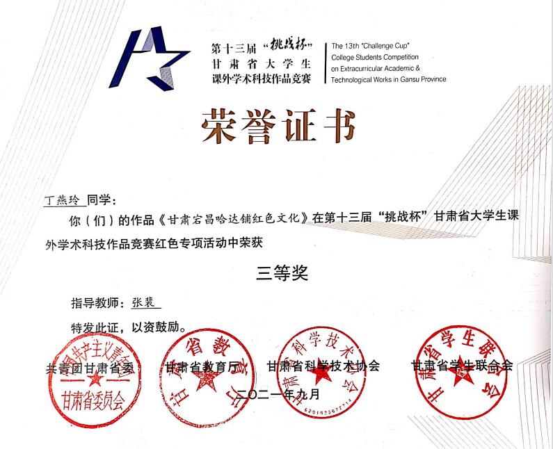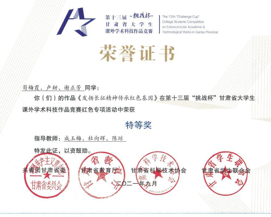 近日,第十三届“挑战杯”甘肃省老员工课外学术科技作品竞赛和红色专项活动竞赛结果公布,共有751个课外学术科技作品和139个红色专项作品拟获奖。3044永利集团有4个作品获奖,其中《发扬长征精神 传承红色基因》作品获红色专项特等奖,《重温革命历史 传承红色基因》作品获红色专项一等奖,《甘肃宕昌哈达铺红色文化》作品获红色专项三等奖,《脱贫攻坚背景下陇南农民群体乡村振兴战略认同状况调查报告》获三等奖。此外,《发扬长征精神 传承红色基因》还获得第十七届“挑战杯”全国老员工课外学术科技作品竞赛红色专项三等奖。